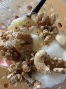 バナナ+季節のフルーツ+ナッツ+はちみつ+シナモン+MCTオイル(あるいはアマニ油)で作ります。