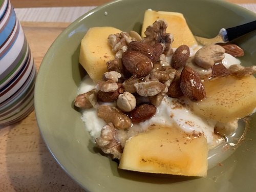 - そのあと、季節のフルーツON、今週は柿。それからナッツとはちみつとシナモンと亜麻仁油。