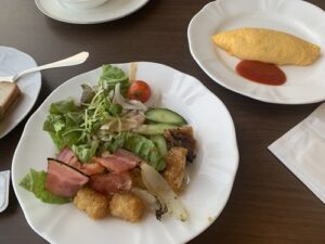 朝食バイキング。お好きな卵メニューをオーダー。私はきのことチーズのオムレツ、夫はスクランブルエッグ。あつあつで持ってきていただけます。お魚や鶏肉、和のごはんやパン、サラダも充実でベーコンは焼き立てかりかり!カレーもあったような。。