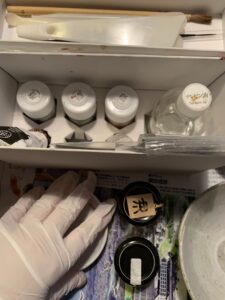 手袋必須! かぶれ防止!ちいさなジャムの空き瓶に「油」「小麦粉」「水」などを小分けしています。あとはコフレのセット。