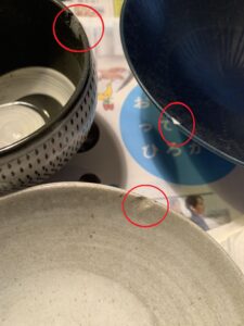 欠けた①湯呑、②小鉢、③平茶わん。修理して大切に使い続けたい器たちです。