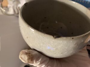 カンタンに言えば欠けたところに漆と粉(小麦粉だったり砥の粉だったり)を埋め込んで、乾かして、下地になる漆を塗って金粉をまく。しかしひとつひとつの手順の前後や乾かすのに1週間以上かけたりと、1つの器の修理に2か月はかかります。ほぼ乾かす=棚に置いている時間。