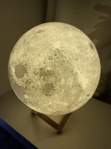 月を3Dプリントで再現した灯りの台。灯りは白と温かみのある色の2色。幻想的。