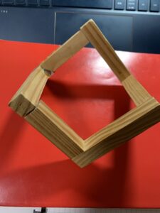 こちらもしばらく放置していた木製の台。木工用ボンドで台の部分をくっつけて、しばしマスキングテープで補強し接着待ち。