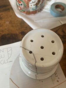 修理の工程はまず写真の①麦漆で接着。マスキングテープで固定して1~2週間おきます(乾かす)。