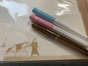 ↓ 書きやすいペンシリーズ。万年筆っぽい。正倉院展で買った「天平の便箋」もお手紙の機会を待ってます。
