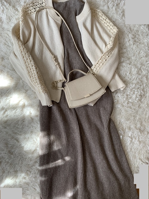 ニットっぽいワンピースと白上着…ZARA、バッグ…ZARA