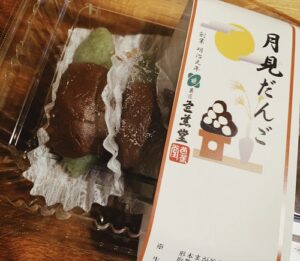 はい、こちら 昨日用事で通りがかった高島屋で、わらびもちのおいしい 芭蕉堂 の お月見団子をゲット。