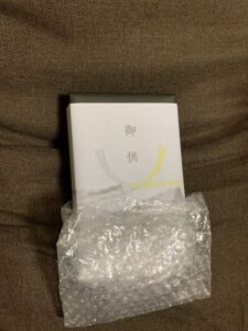 初盆での集まりは特にないとはいえ、さすがにお供えは持参しよ。高野山大師堂さんのお線香で間違いない。ちょっと豪華版で。のしは義実家方面では黄熨斗ではないような気がしつつもずっとこれでやってきてる大阪嫁。夫の名前でお仏壇の前に。