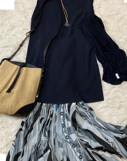紺のノースリニットワンピは20代の時から着ている、当時まだ大阪北浜にあった三越で買ったもの。さすが三越のニットは伸びますな…いやモノがいいのでしょうね。カーディガンはシルクの薄くて着易いもので買ったのは5年前くらいだったか。。スカートは得意のディノス、「プッチ風スカート」と呼んでます。そのまま(笑)。ネックレスはスワロ。こちらも20年くらい前に買ったかな。。いずれも厳しい断捨離眼を潜り抜けてきた精鋭たちです。くたびれるまで、繕い直しつつ着るぞ~。