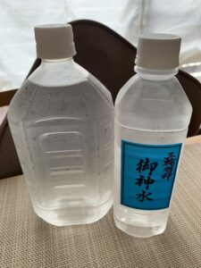 手ぶらで行っても紙コップがあるので頂けます。持ち込んだマイボトルに汲んでもいいし、境内で販売されている大小ペットボトルを買うこともできます。下の写真右のは100円。ありがたや。。