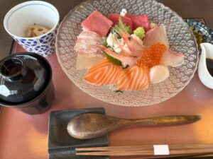 私は海鮮丼、夫は大人のお子様ランチ的な洋食セット。和食も洋食も伊勢エビも蟹もふぐちりもおいしそうで、食後のコーヒーとデザートも美味しく頂戴しました。近所にあったら絶対通いたい、和のお店です。