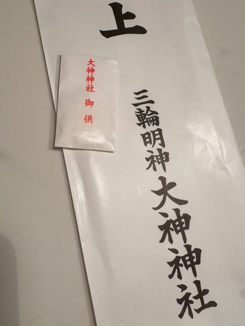 お札とお米。お札は家の南むきに置き、お米はご飯を炊く時に一緒に炊いていただきます。