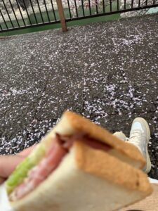 私:「全然どうぞ!(BLTもぐもぐもぐ&頭上の桜を愛でる)」