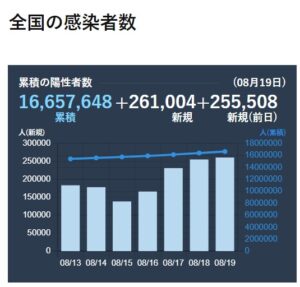 これだけ感染が日々増えていて、飲み会も案の定延期。秋の観月会も中止のところがでてきだして、連日25万人越えの感染者。お盆と夏休みで人の流れが盛んなのでそりゃそうだよなと思いつつ