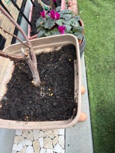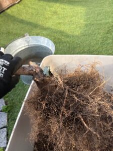 そのうち1つは植えて以来の「鉢替え」を実施。ものすごく土が固くなって根がしっかり張ってて、根鉢をくずすのが大変でした。が、ユーチューブの予習・ご指導もあってどこまでやっていいかを理解したことで、土をかきとり下の方の根をノコギリでカットして思い切りのよい根っこさばき?頑張りました。