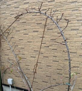 つるバラ2種のうち、「ブラン・ピエール ド ロンサール」をリフォーム予定のウッドデッキから日当たりのよい玄関横に移動させ、誘引してみました。