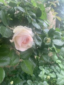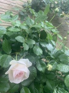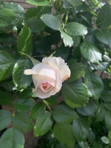 8年目のブラン・ピエール・ドゥ・ロンサール。 いつもは5月の中旬以降に咲いていたのですが、今年は場所を西→南に移動して、日差しをしっかり浴びて、ゴールデンウィーク直前に1輪開いてくれました。