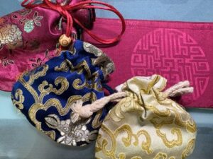 黄色の小ぶりの巾着、紺色の小ぶりの巾着は大切なモノを保管するのに使ってます。
