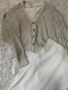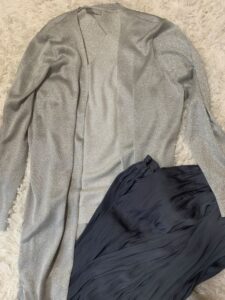 ラメラメシルバーVノースリーブとラメラメシルバーロングカーディガン。