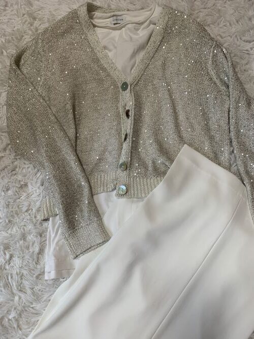 ZARAでスパンコールニットのニットカーディガンがあったのでゲットしてみました。思ったよりキラキラキレイに輝いています。インナーのTシャツは4年ほど前に買ったラビッシュゲートで何度洗濯してもいまだ優しい肌触り。パンツは6~7年前に買ったいにしえのユニクロで、さらりとした生地のワイドパンツ。ZARAの細めのパンツでもよき。同系色でまとめて超・膨張色に仕上がっていますが…気にしない。白のスニーカーを合わせてGO!