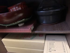 断捨離でスペースができた食器棚の一番下に入れておきます。お正月の大皿や夫婦二人になったら使いたいお米を炊くお鍋。あまり開けない扉。