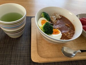 おひるごはんは、朝夫が作ってくれてそのままいただいた「野菜スープ」をアレンジ。鶏ミンチとハヤシライスのもとを入れて十六穀米100gといただきます。私の推しは「完熟トマトのハヤシライス」by ハウス食品。子供が小さいころからお世話になってます。