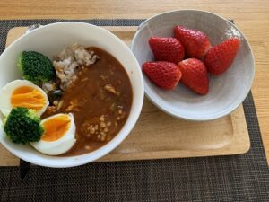 冷蔵庫に季節のフルーツも常備して、食事の最後にいただくようにしてます。入院中の食事がそんな感じだった。1日3食のうち1回フルーツ付き。朝バナナは1本。夕食にりんごなら三分の一、キウイなら半分。今日は特別に、朝のバナナに続いてお昼いちご5つ、ちょっと多め。