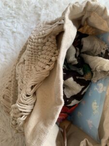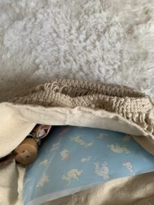 中にはキャンバス地の巾着がはいっていて、ここに入れないと編み目の間からおちる(笑)
