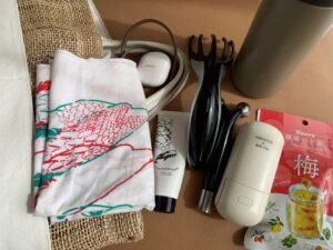マッサージ系以外は普段の夏のお出かけでも持ち歩くもの。これに折り畳みの日傘か帽子とサングラスかを追加する感じ。