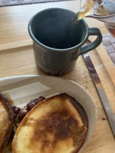 ↑少し焦げましたがホットケーキミックスに十勝産の餡子をはさんで黒蜜で。おいしゅうなりました。