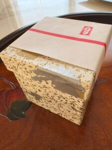 蓋に松と梅が扇形に、本体に竹が金で描かれていて、松竹梅とおめでたい。いただいた箱のまま、30年近くという長き眠りから覚めて、いざ出番です。