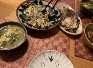 最近はさらに手際も早くなって、ぱぱぱっと大根おろしも早い。下の写真は左からわかめと卵のスープ、モヤシしめじほうれんそう炒め、焼サバ大根おろしのせ、鶏塩焼き、かな。「今日あるもの」をみてぱぱっとつくるようになって、さすがです。素晴らしきかな。