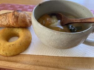 時折いれているスパイスは「ヒハツ」内臓を温める効能があります。ちょっと「カイゲン(風邪薬)」のにおいがする。。そこに糖質を50%ほどカットしているクロワッサンとバナナ焼きドーナツと、あとフルーツと一緒にいただく朝。