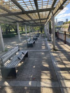 お堀のそばのベンチ。ここからは石垣と堀しかみえません(大阪城は茂った木でみえない)。ただただ雄大な石垣ビューを愛でる。人がいなくなったスキに撮ってみた。