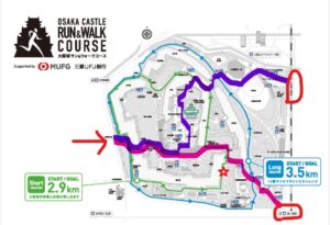 MAPは大阪城ランのHPからダウンロードしたものに加筆してみました。ピンクがJR森ノ宮ゴール。紫が本丸を通ってJR大阪城公園駅ゴール、私のゆったり徒歩で30分~40分くらいのコースです。