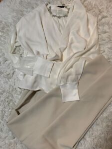白&ピンク。上は変えずに、安定のプチプラピンク。下を白にして上を優しいピンク。なんとも優しい色を着る日が私にも来るなんて感慨深い。