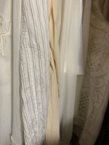 白っぽいものエリアがこちら。シアーシャツ、シアーブラウス、カーディガン、Tシャツ、ガーゼ素材系、レース素材系…。白すぎると強すぎる(負ける)。茶っぽくなるとくすむ。どうする?!白の組み合わせ問題。