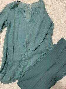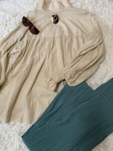 白&緑(ZARA)。青っぽい緑、好きな色でなかなかに涼し気。真っ白より2枚目のオフ白の方が好み。野趣あふれるブローチとサングラスで。生地が薄いからこの袖でもなんとかいけるかも。