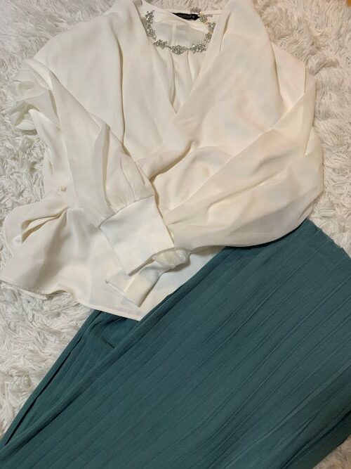 白&緑(ZARA)。青っぽい緑、好きな色でなかなかに涼し気。真っ白より2枚目のオフ白の方が好み。野趣あふれるブローチとサングラスで。生地が薄いからこの袖でもなんとかいけるかも。