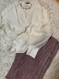 白&ピンク。上は変えずに、安定のプチプラピンク。下を白にして上を優しいピンク。なんとも優しい色を着る日が私にも来るなんて感慨深い。