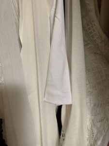 白っぽいものエリアがこちら。シアーシャツ、シアーブラウス、カーディガン、Tシャツ、ガーゼ素材系、レース素材系…。白すぎると強すぎる(負ける)。茶っぽくなるとくすむ。どうする?!白の組み合わせ問題。