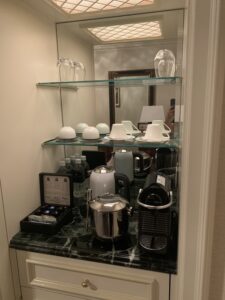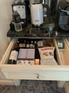 お水のボトルも6本ほどおいてくださっていて、お水よく飲むのでありがたい。しかも鉱水、ミネラル補給。ターンダウンの際にアイスボックスに氷が入ってました。