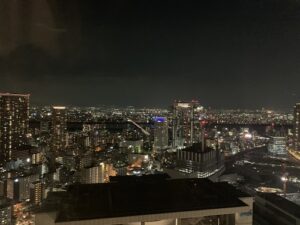 大きな窓からみる夜景。真ん中あたりに横一文字にある黒い帯=淀川ですね。20時近い時間に続々伊丹空港に降り立つ飛行機の流れがキレイ。高層ビルの赤いランプが点滅して蛍のようです。。お茶をのんでひっそり、しみじみ物思いにふけます。